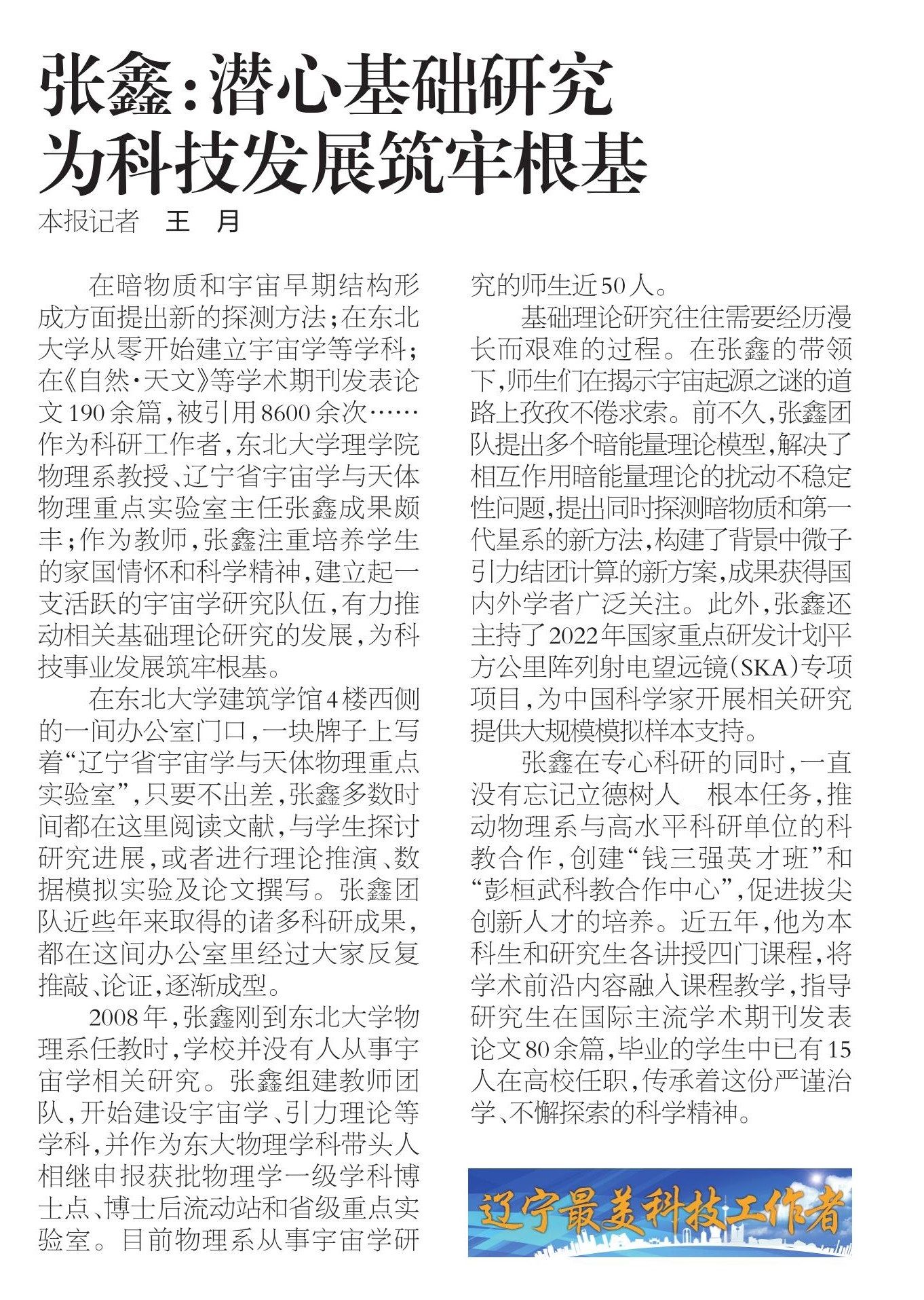 在暗物质和宇宙早期结构形成方面提出新的探测方法;在太阳成集团tyc33455从零开始建立宇宙学等学科;在《自然·天文》等学术期刊发表论文190余篇,被引用8600余次……作为科研工作者,太阳成集团tyc33455理学院物理系教授、辽宁省宇宙学与天体物理重点实验室主任张鑫成果颇丰;作为教师,张鑫注重培养学生的家国情怀和科学精神,建立起一支活跃的宇宙学研究队伍,有力推动相关基础理论研究的发展,为科技事业发展筑牢根基。