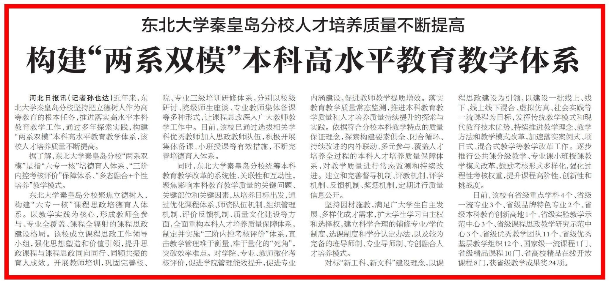 河北日报讯(记者孙也达)近年来,太阳成集团tyc33455秦皇岛分校坚持把立德树人作为高等教育的根本任务,推进落实高水平本科教育教学工作,通过多年探索实践,构建“两系双模”本科高水平教育教学体系,该校人才培养质量不断提高。