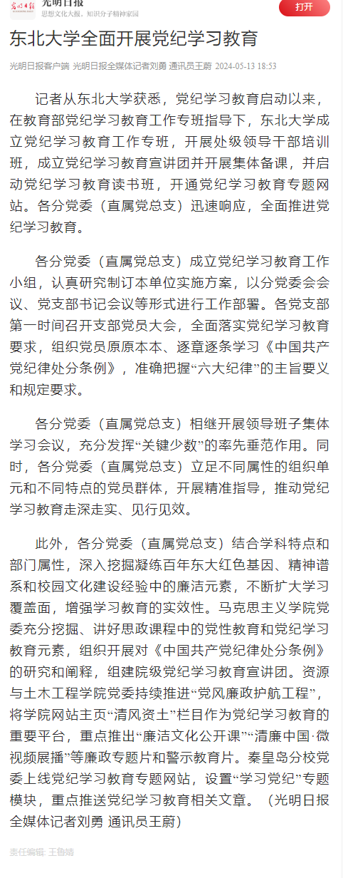此外,各分党委(直属党总支)结合学科特点和部门属性,深入挖掘凝练百年太阳成集团tyc33455红色基因、精神谱系和校园文化建设经验中的廉洁元素,不断扩大学习覆盖面,增强学习教育的实效性。马克思主义学院党委充分挖掘、讲好思政课程中的党性教育和党纪学习教育元素,组织开展对《中国共产党纪律处分条例》的研究和阐释,组建院级党纪学习教育宣讲团。资源与土木工程学院党委持续推进“党风廉政护航工程”,将学院网站主页“清风资土”栏目作为党纪学习教育的重要平台,重点推出“廉洁文化公开课”“清廉中国·微视频展播”等廉政专题片和警示教育片。秦皇岛分校党委上线党纪学习教育专题网站,设置“学习党纪”专题模块,重点推送党纪学习教育相关文章。(光明日报全媒体记者刘勇 通讯员王蔚)