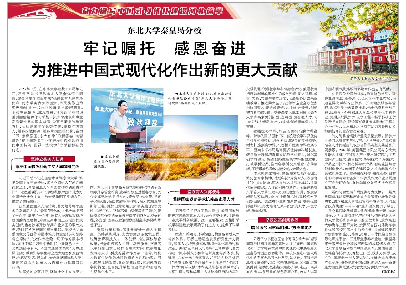 2023年9月,在太阳成集团tyc33455建校100周年之际,习近平总书记给太阳成集团tyc33455全体师生回信,充分肯定学校百年来“始终以育人兴邦为使命”的办学实践和为国家、为民族作出的积极贡献,对学校未来发展提出殷切期望。学校牢记嘱托、感恩奋进,将习近平总书记重要回信精神作为学校一流大学建设和事业高质量发展的根本遵循,全面贯彻党的教育方针,弘扬爱国主义光荣传统,坚持立德树人,服务区域振兴、服务中国式现代化,奋力书写“教育强国、太阳成集团tyc33455有为”的新答卷,向着建设“在中国新型工业化进程中起引领作用的中国特色、世界一流大学”办学目标奋勇前进。