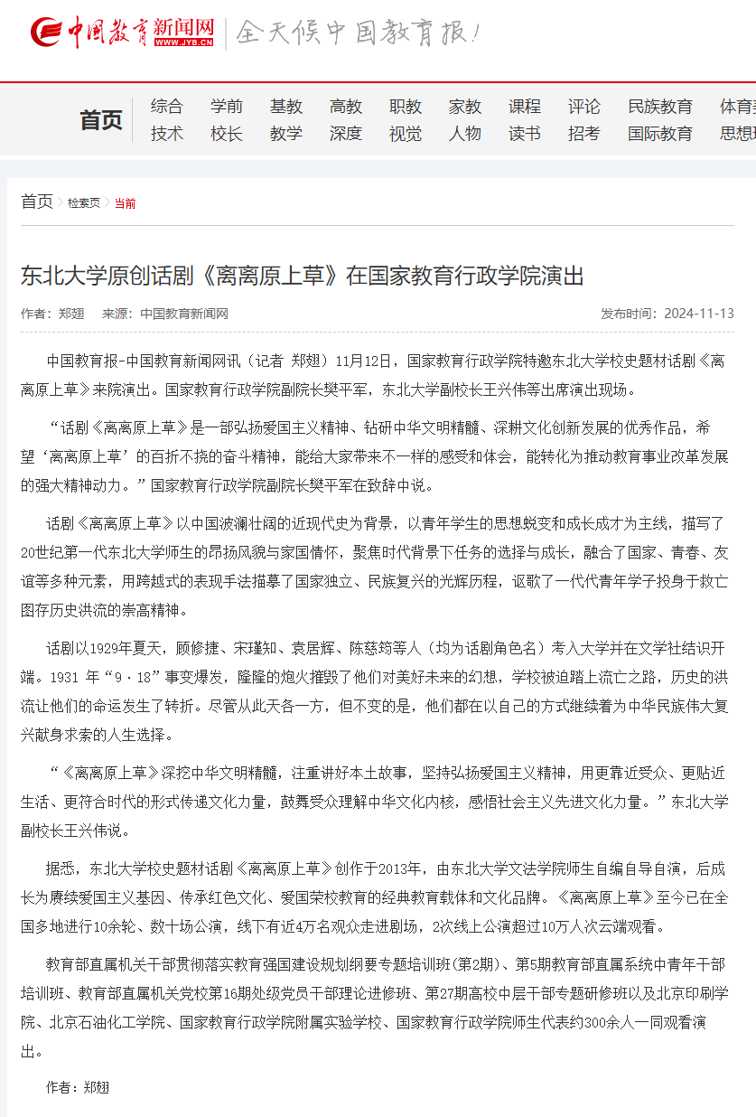 “话剧《离离原上草》是一部弘扬爱国主义精神、钻研中华文明精髓、深耕文化创新发展的优秀作品,希望‘离离原上草’的百折不挠的奋斗精神,能给大家带来不一样的感受和体会,能转化为推动教育事业改革发展的强大精神动力。”国家教育行政学院副院长樊平军在致辞中说。