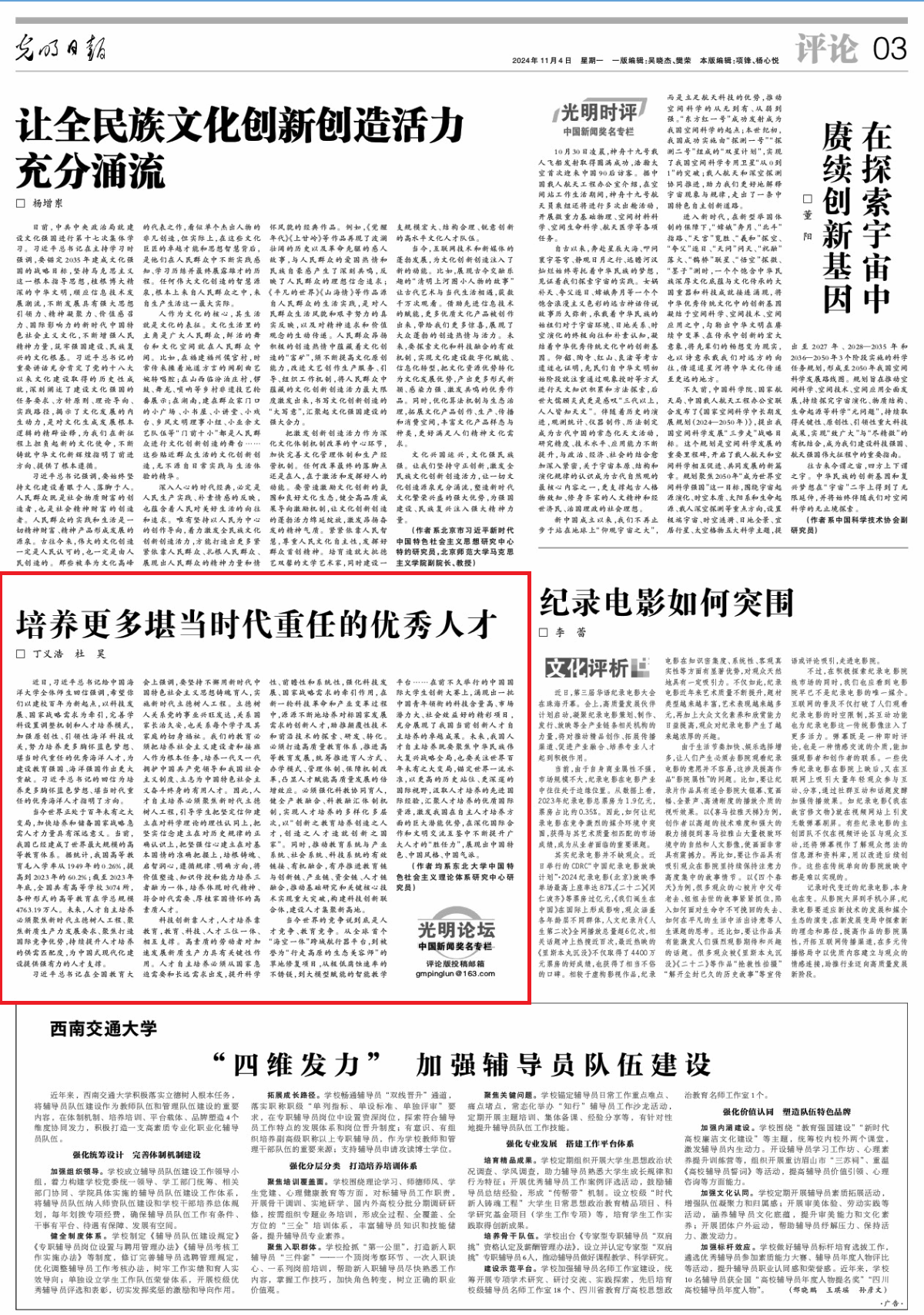 当今世界的竞争说到底是人才竞争、教育竞争。从全球首个“海空一体”跨域航行器平台,到被誉为“行走高原的生态美容师”的草地修复项目,从极低腐蚀速率的不锈镁,到大模型赋能的智能教学平台……在前不久举行的中国国际大学生创新大赛上,涌现出一批中国青年领衔的科技含量高、市场潜力大、社会效益好的精彩项目,充分展现了我国当前创新人才自主培养的卓越成果。未来,我国人才自主培养既要聚焦中华民族伟大复兴战略全局,也要关注世界百年未有之大变局,锚定世界一流水准,以更高的历史站位、更深邃的国际视野,汲取人才培养的先进国际经验,汇聚人才培养的优质国际资源,激发我国在自主人才培养方面的巨大潜能优势,在深化国际合作和文明交流互鉴中不断提升广大人才的“胜任力”,展现出中国特色、中国风格、中国气派。