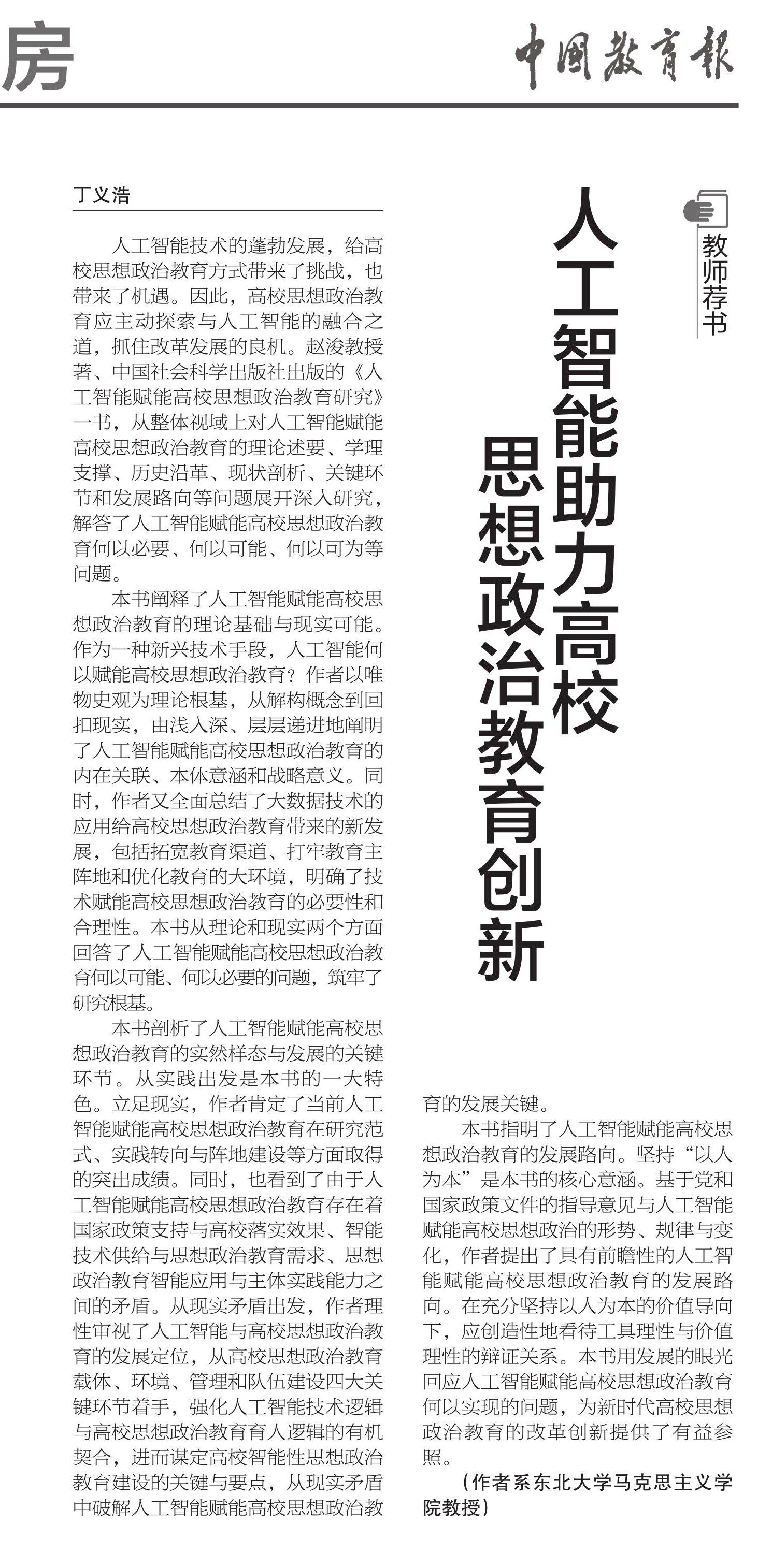 人工智能技术的蓬勃发展,给高校思想政治教育方式带来了挑战,也带来了机遇。因此,高校思想政治教育应主动探索与人工智能的融合之道,抓住改革发展的良机。赵浚教授著、中国社会科学出版社出版的《人工智能赋能高校思想政治教育研究》一书,从整体视域上对人工智能赋能高校思想政治教育的理论述要、学理支撑、历史沿革、现状剖析、关键环节和发展路向等问题展开深入研究,解答了人工智能赋能高校思想政治教育何以必要、何以可能、何以可为等问题。
