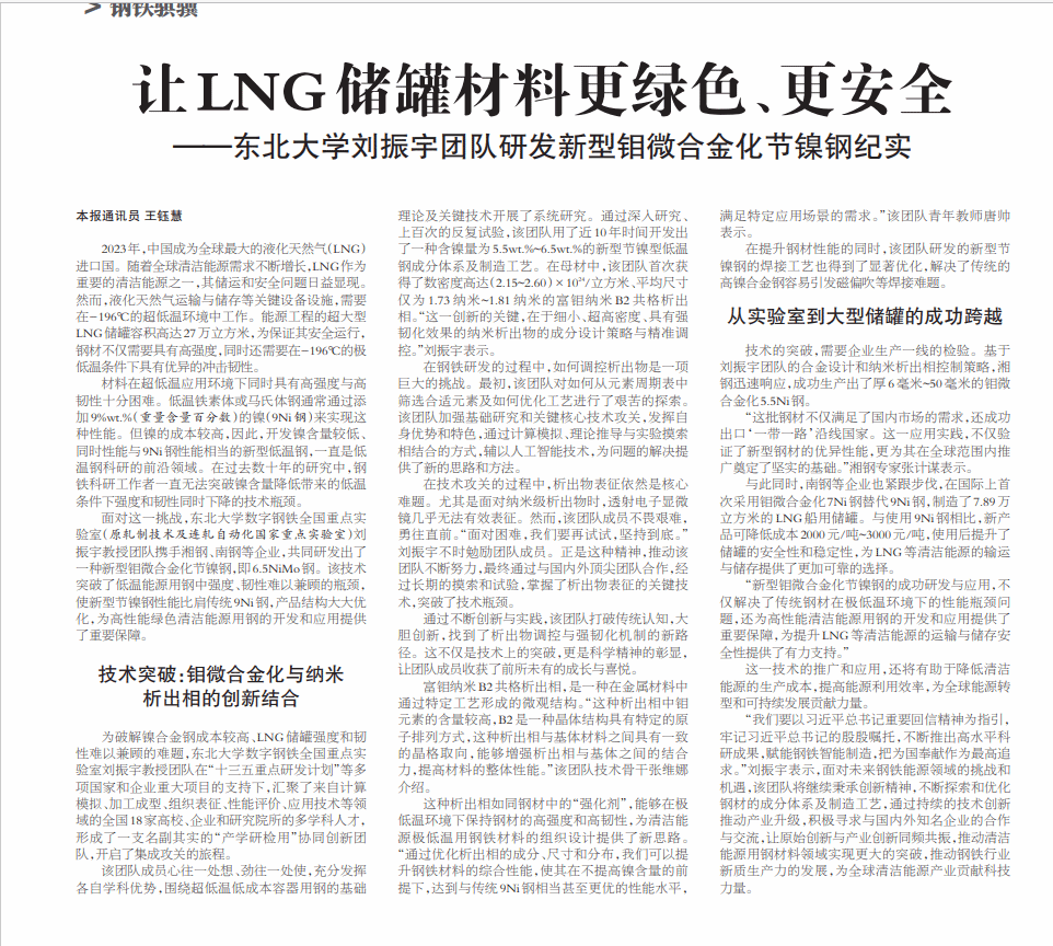 “新型钼微合金化节镍钢的成功研发与应用,不仅解决了传统钢材在极低温环境下的性能瓶颈问题,还为高性能清洁能源用钢的开发和应用提供了重要保障,为提升液化天然气等清洁能源的输运与储存安全性提供了有力支持,更为清洁能源产业的繁荣注入了新的活力。”
