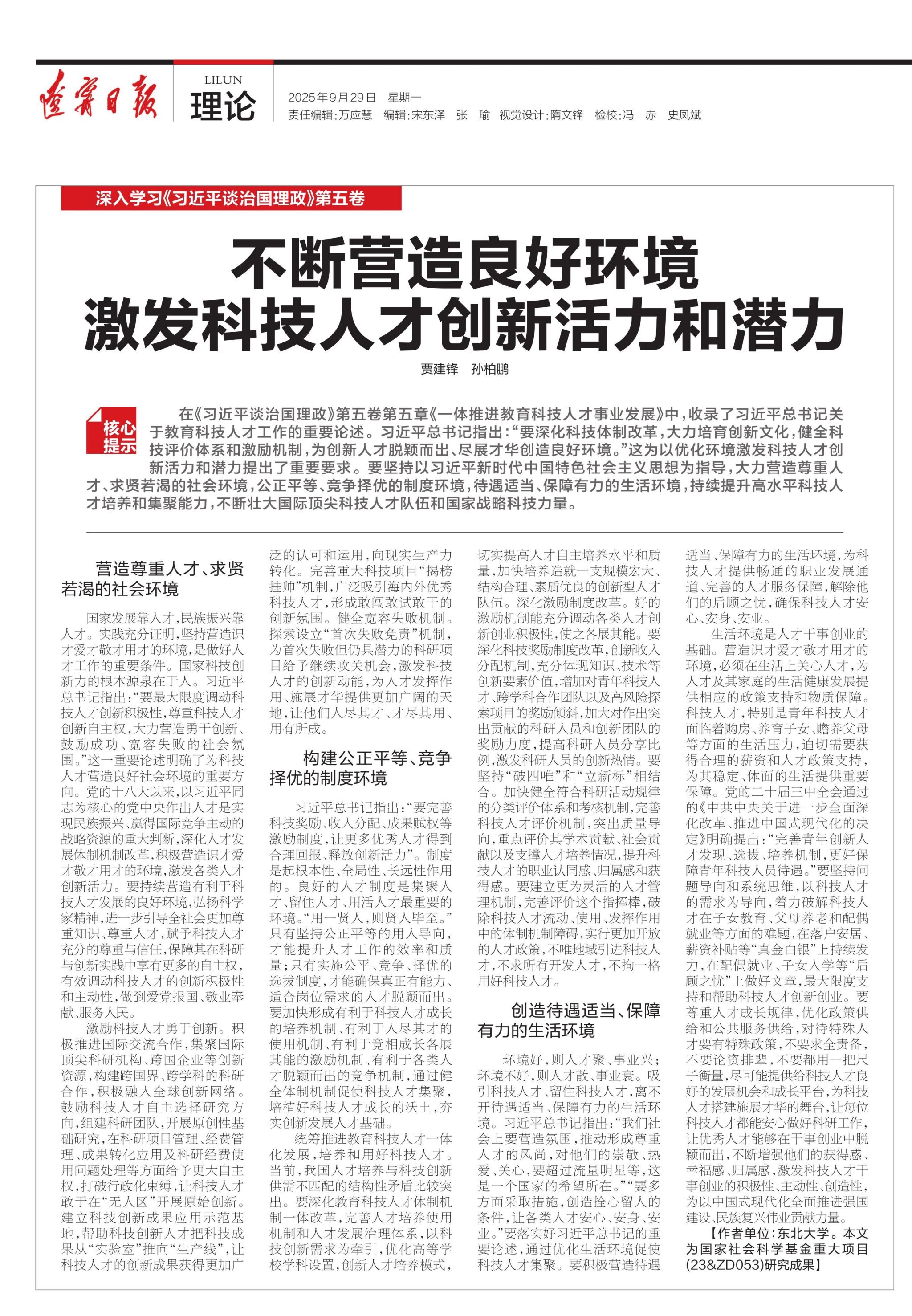 在《习近平谈治国理政》第五卷第五章《一体推进教育科技人才事业发展》中,收录了习近平总书记关于教育科技人才工作的重要论述。习近平总书记指出:“要深化科技体制改革,大力培育创新文化,健全科技评价体系和激励机制,为创新人才脱颖而出、尽展才华创造良好环境。”这为以优化环境激发科技人才创新活力和潜力提出了重要要求。要坚持以习近平新时代中国特色社会主义思想为指导,大力营造尊重人才、求贤若渴的社会环境,公正平等、竞争择优的制度环境,待遇适当、保障有力的生活环境,持续提升高水平科技人才培养和集聚能力,不断壮大国际顶尖科技人才队伍和国家战略科技力量。