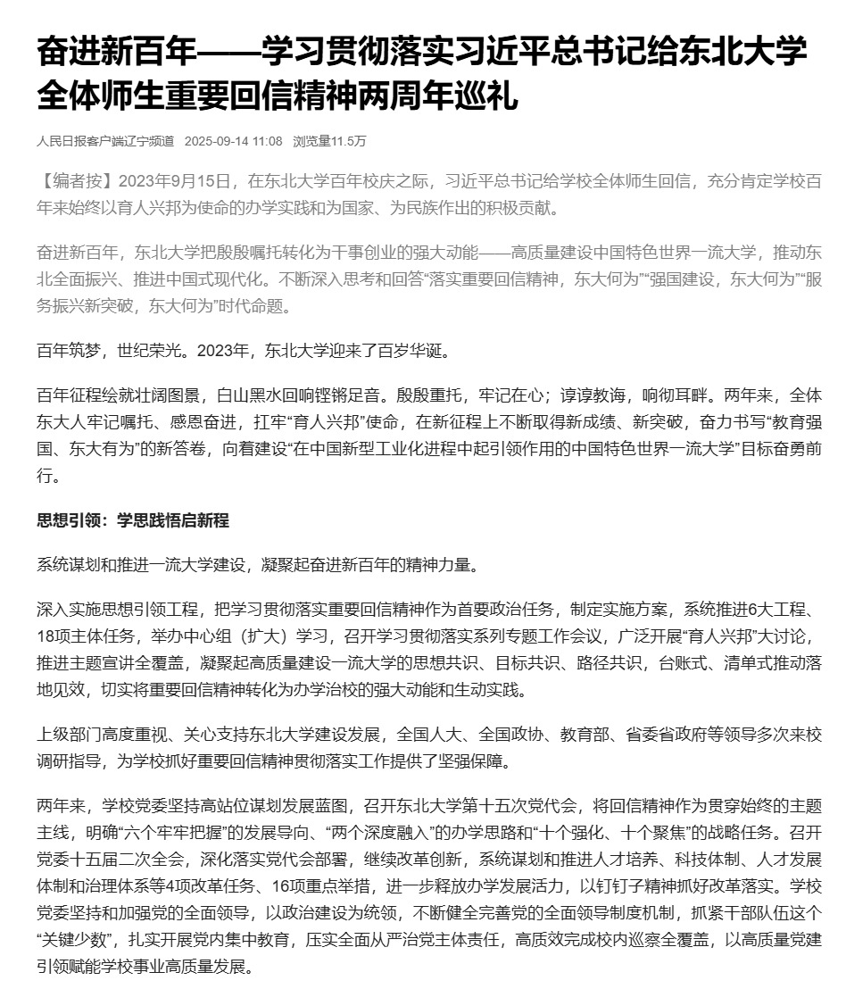 深入实施科技跃升工程,打造国家战略科技力量,服务高水平科技自立自强。积极培育国家级重大科研平台,实现3个全国重点实验室重组成功,围绕推进新型工业化、培育发展新质生产力战略急需,聚焦“两重两新”推进科研能力建设项目,启动实施学科先导项目,在信息技术、高端材料、深地与战略性矿产开采等领域,持续打造一批“技术研发-装备集成-场景应用”工程示范。突破深部工程岩体力学与灾害防控世界难题,相关科技成果有力支撑了雅下水电开发、川藏铁路等多个国家重大战略工程建设。两年来,学校荣获国家科学技术奖励2项,牵头获省部级科技奖励72项;“科研经费三年倍增计划”顺利推进,2025年度科研进款预计突破20亿元;获批国家自然基金委重大人才类项目、国家重点研发计划等重大项目55项,获批卓越研究群体项目A类(原基础科学中心项目)1项,实现辽宁省高校首次突破,荣获中国青年科技奖和国家专利优秀奖。以第一作者、第一单位在Science和Nature正刊发表论文。哲学社会科学研究不断取得新进展,支撑构建中国哲学社会科学自主知识体系的成果产出能力不断提升。