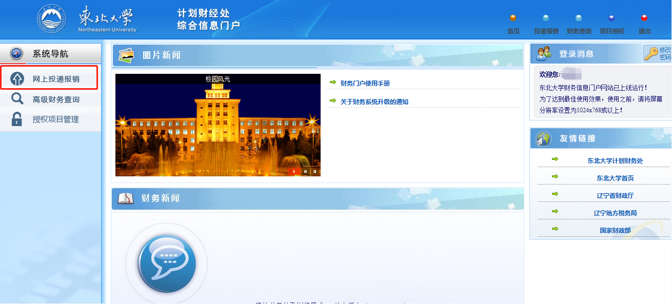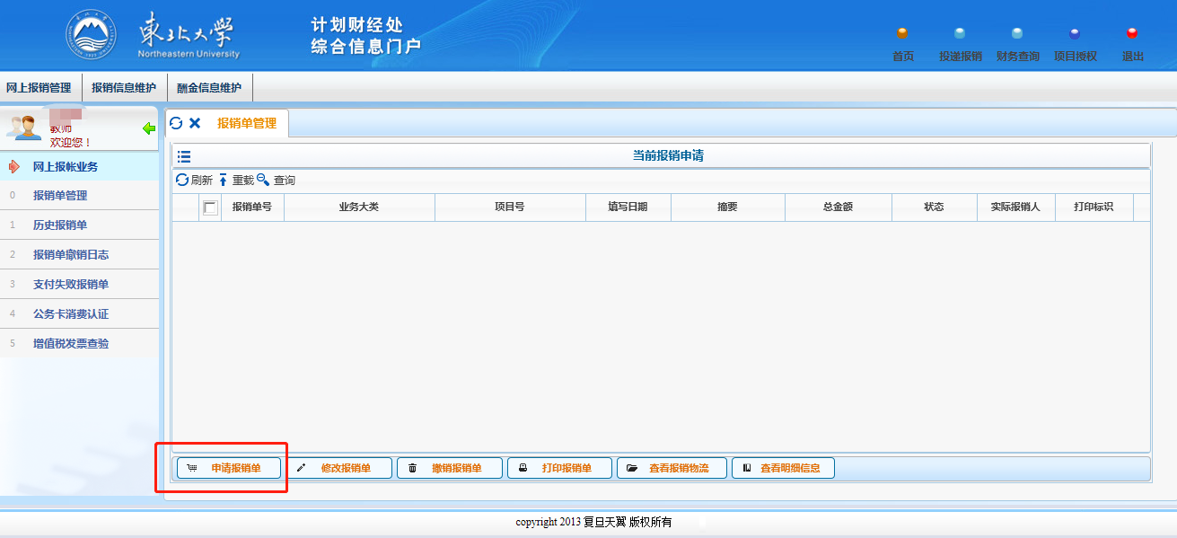 2. 点击“网上投递报销”→点击“申请报销单”。