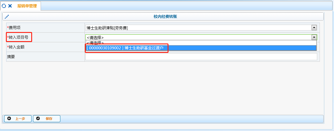 “转入项目号”处,只有一个选项,选择“[000000030109002]博士助研基金过渡户”;