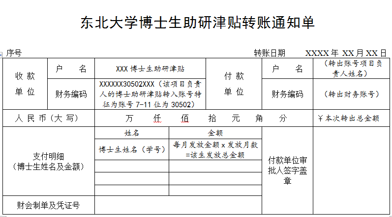 其中,转出账号项目负责人原则上与转入账号户名为同一人,如二者不为同一人,则需在“博士生助研津贴转账通知单”空白处注明代转原因。