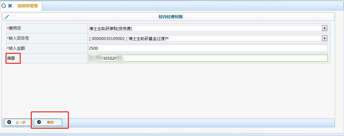填写完成后,点击“保存”,即可生成内转博士生助研津贴网上投递报销单。