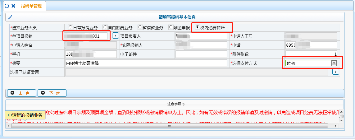 “单项目报销”处,填写转出的财务编码(即“博士生助研津贴转账通知单”中付款单位财务编码);