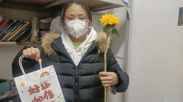 已经推免保送的同学自愿担任配送员,传递温情,将福袋高效有序地配送至每位考研学子的寝室门口,实现无接触配送,确保了考研学子考试前良好的身体状态。