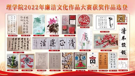 近日,理学院党委组织开展了2022年廉洁文化作品大赛。各党支部认真组织,广大师生积极参与,共征集到63份作品。经专家评审,13份作品获得校级奖励,27份作品获得院级奖励。后续,学院将选取本次廉洁文化作品大赛部分作品在学院网站等媒体平台进行展览,进一步扩大廉洁文化在学院广大师生中的影响力和渗透力,厚植廉洁文化根基,充盈风清气正校园文化氛围。