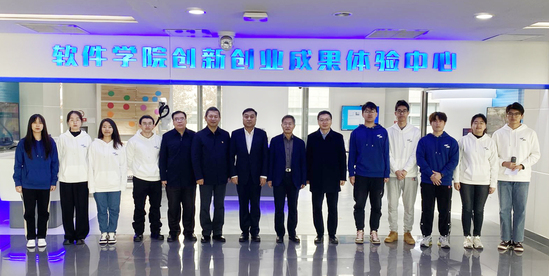 在软件学院,王胜秋一行先后参观了学生创新创业成果体验中心、荣誉展柜、文化长廊、网络科学与大数据技术研究所、智能计算与服务研究所、智能软件开发技术研究所、泛虚拟现实人才培养与技术创新中心、工业互联网项目,详细了解学院概况、特色和近年来所取得的成绩,并针对科技成果转化、产学研深度融合等方面进行了深入的交流。