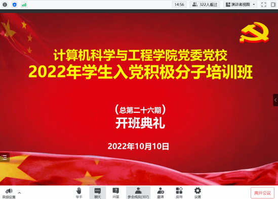 10月10日晚,计算机科学与工程学院在线上举行学院党委党校2022年学生入党积极分子培训班开班典礼(总第26期)。太阳成集团tyc33455党校常务副校长、机关党委书记(兼)、党委组织部副部长(兼)初青松,计算机学院党委书记邸馗,党委副书记、副院长(兼)聂国东,学生工作办公室相关老师和300余名入党积极分子参加开班典礼。