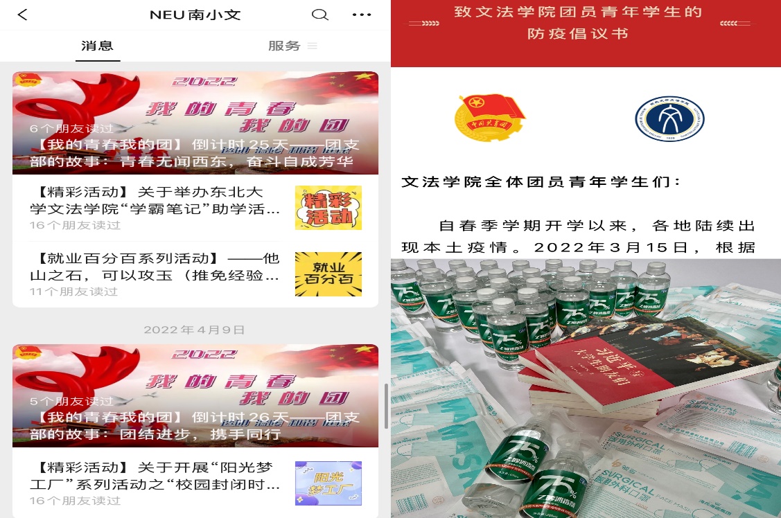 矢志不移,坚持思想引领。学院严格落实校园疫情防控的工作要求,深入学生寝室,为学生们赠送《习近平与大学生朋友们》等书籍,丰富学生校园封闭管理期间的文化生活。依托学院公众号,发布“致文法学院青年学生的防疫倡议书”和“致同学们的一封信”,引导文法学子齐心协力,共克时艰,树立起战胜疫情,守护平安校园的坚定信念。常态化推进主题团日和“青年大学习”网上主题团课学习,依托校团委“百年百讲”系列主题宣讲和学院“我的青春我的团”建团百年倒计时活动,加强网络思想引领,凝聚青年信仰。
