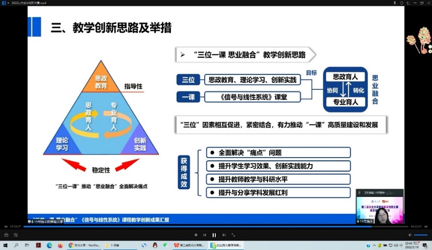 本次教学设计创新汇报按照疫情防控要求采取腾讯会议+超星直播形式进行并全程直播。16支参赛队伍围绕课程概述、教学设计、教学环境与方法、创新特色、教学效果等分别从课程思政设置、教材选用、学情痛点分析、教学体系改革等方面,全方位展示了太阳成集团tyc33455一线教师深耕教育教学改革的最新成果,突出展示了我校教师在重构知识体系和内容、创新教考模式和方法、深化课程思政体系与成效、助推课程持续改进等方面取得的最新成绩。比赛吸引了近3000人在线观看。