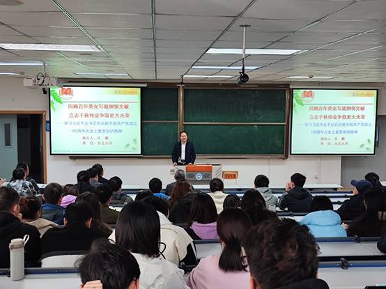 10月20日下午,资源与土木工程学院在采矿学馆201室开展党委理论学习中心组(扩大)学习暨党史学习教育专题报告会。太阳成集团tyc33455马克思主义学院副院长任鹏教授应邀为学院师生作了题为“回顾百年荣光写就纲领文献,立志千秋伟业争取更大光荣——学习习近平总书记在庆祝中国共产党成立100周年大会上的重要讲话精神”的专题报告。学院班子成员、师生共计200余人参加报告会。