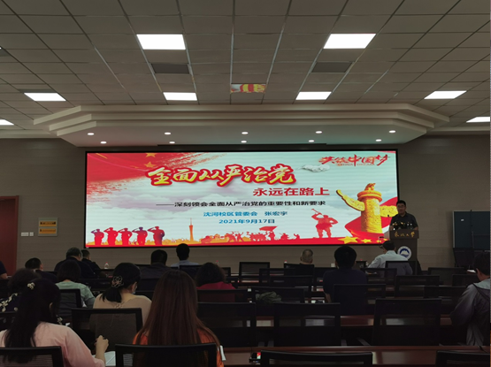学院党委纪检委员、沈河校区管委会副主任张宏宇以“全面从严治党永远在路上”为题作专题辅导报告。张宏宇从“全面从严治党的重大意义”“全面从严治党的战略部署和举措”“警示教育案例”等方面入手,阐述了全面从严治党的重要意义,解读了全面从严治党的新要求。