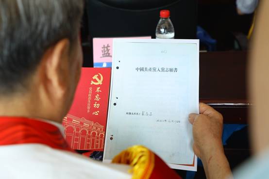 学院还为与会的老党员们准备了一份“特殊”的惊喜,那就是老党员们自己《入党志愿书》的影印件和一份定制的政治生日贺卡。抚摸着胸前的纪念章,看着年轻时亲笔写下的入党志愿书,老同志们激动的心情溢于言表。