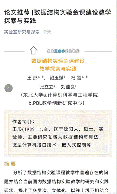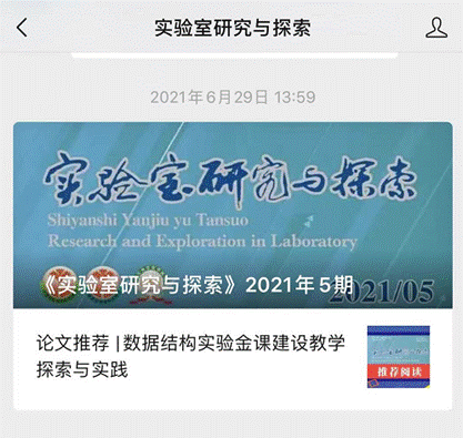 6月29日,中文核心期刊《实验室研究与探索》第5期将计算机国家级实验教学示范中心信息化平台及实验金课建设成果论文《数据结构实验金课建设教学探索与实践》作为本期的唯一推荐论文指定推荐在其同名公众号。