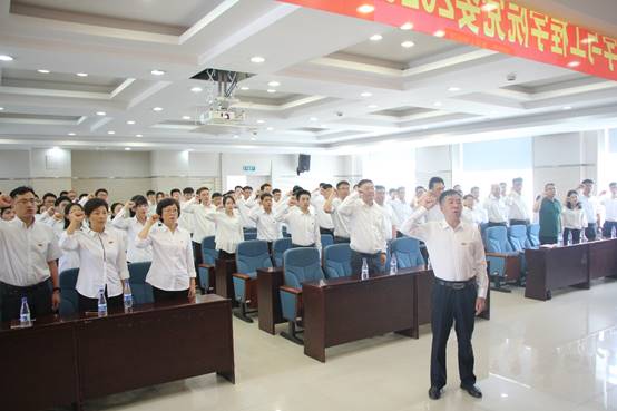 表彰仪式结束后,由张玉宝领誓,全体与会人员重温了入党誓词,党员们目光如炬,誓言铿锵有力。