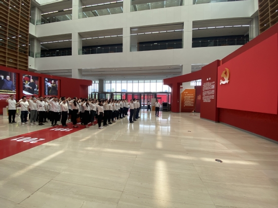 步入展厅,鲜红的党旗和金色的党徽熠熠夺目。全体党员庄严肃立于党旗前,由学院党委书记滕超领誓,重温入党誓词,为共产主义奋斗终身的誓言铿锵有力、响彻大厅。