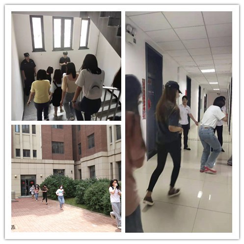演练开始前,各参演单位进行了周密的部署和动员。随着模拟火灾警报声响起,参与逃生演练的同学们按照预定方案,在楼层疏散引导员的指挥下开始逃生。同学们用湿毛巾捂住口鼻,匍匐弯腰,相互提醒,有序地从安全通道疏散撤出,转移至室外安全区域后点名报数。