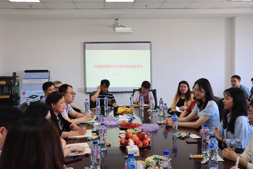 6月23日,外国语学院2021届毕业生座谈会在主楼1004室召开。外国语学院班子成员、各系及各办公室负责人、毕业生辅导员出席会议,与学院毕业生代表亲切座谈。