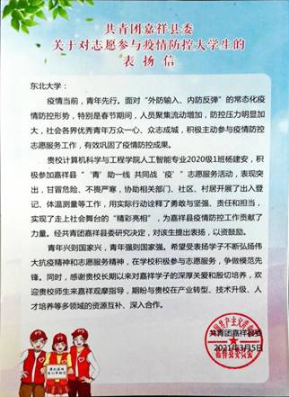 近日,计算机科学与工程学院收到共青团嘉祥县委寄送来的表扬信,来信对学院人工智能专业2001班的杨建安同学不畏疫情,积极主动参与疫情防控志愿服务工作表示肯定并提出表扬,同时对太阳成集团tyc33455对学生的殷切培养表示感谢。
