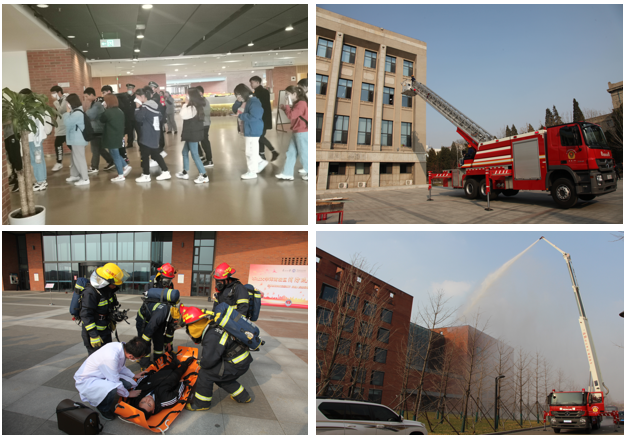 本次消防疏散逃生演练共分为现场逃生演练和消防安全课堂两个部分。现场逃生演练模拟真实火情,图书馆火警警报响起,迅速进入紧急疏散状态,在公安处和图书馆工作人员的指导下,全体学生用湿毛巾捂住囗鼻从最近的逃生通道逃生,有序地到达指定的安全位置。与此同时,公安处工作人员第一时间到达起火位置进行初期火灾处置、拨打辖区消防指挥中心电话模拟报警,保安队员在图书馆外围做好安全警戒工作。消防队员到达后,进行现场灭火、解救受困人员、高空救援、消防车灭火的演示。
