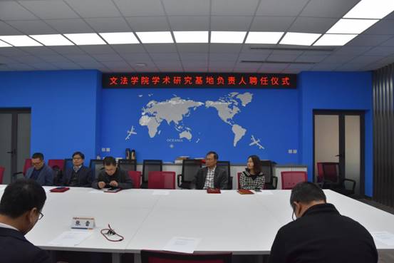 隋永强宣读了文法学院学术研究基地负责人的聘任文件。张雷为基地负责人颁发了聘书。