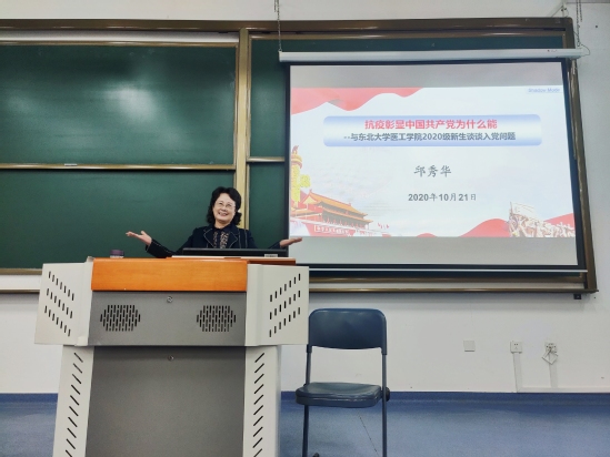 邱秀华以“抗疫彰显中国为什么能”为主题,结合习近平总书记在全国抗击新冠肺炎疫情表彰大会重要讲话精神,从理论和实践相结合的视角,通过对“坚持党的集中统一领导的显著优势”、“发挥我国社会主义制度的显著优势”和“共产党人以人民为中心的价值追求”三个层面的分析探讨,帮助学生正确认识中国共产党在领导抗疫伟大斗争中的地位和作用。邱秀华从“什么是中国共产党”“为什么加入共产党”“怎样才能加入共产党”三个方面展开深入阐述,带领同学们思考中国共产党这个百年大党为何能青春永驻,进而引导新生去感悟入党的初心,领悟共产党人的使命。
