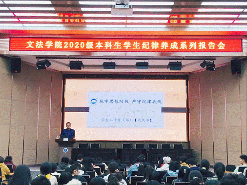 10月20日,文法学院2020级本科生学生纪律养成系列报告会在文管学馆B230举行,学生工作处副处长徐长文受邀为大一新生做“筑牢思想防线 严守纪律底”主题报告。文法学院党委副书记、副院长夏风云及学生工作相关同志参与本次会议。