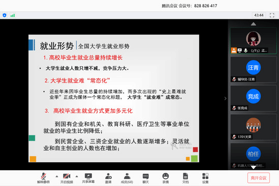 5月11日,机器人科学与工程学院在腾讯会议平台开展就业指导教育。学院学生工作办公室相关负责同志、2017级全体本科生参会。
