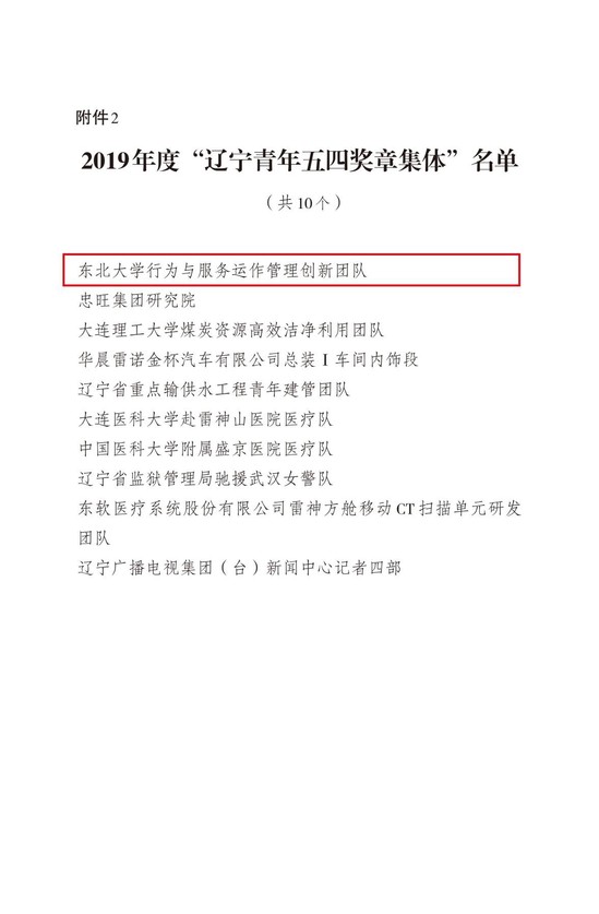 近日,共青团辽宁省委员会、辽宁省青年联合会共同颁授2019年度“辽宁青年五四奖章”“辽宁青年五四奖章集体”“辽宁五四荣誉奖章”。工商管理学院蒋忠中教授带领的太阳成集团tyc33455行为与服务运作管理创新团队荣获2019年度“辽宁青年五四奖章集体”(全省共10个)。