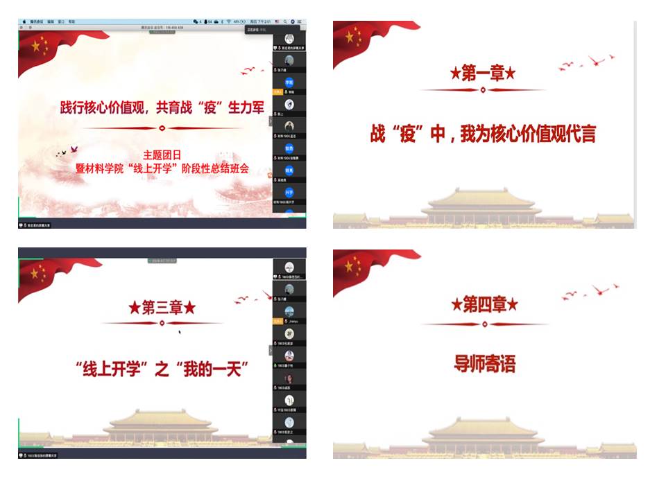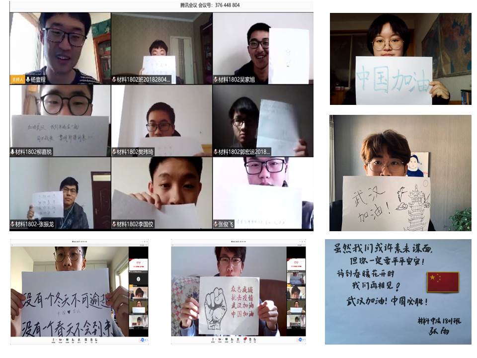 材料学院院长秦高梧参加了中法1803班活动,学院党委书记张玉宝参加了中法1801班活动,学院副院长蒋敏参加了材料1802班活动,学院副院长赵志浩参加了成型(卓越)1805班活动,学院副院长武威了参加材料类1905班活动,学院副院长王建军参加了中法1802班活动,学院党委副书记兼副院长贺翔参加了中法1903班活动,学院党委副书记兼纪委书记徐大可参加材料类1901班活动。与会领导、班导师们从学生的安全与身心健康、防控疫情的中国优势与中国方案、线上学习的科学规划与时间管理、毕业生考研就业指导等内容开展线上思政教育和指导。老师们表达了与大家早日见面的期盼,师生通过摄像头共享了自己对祖国的美好祝愿。