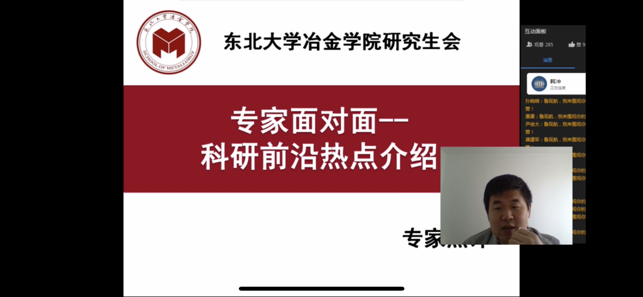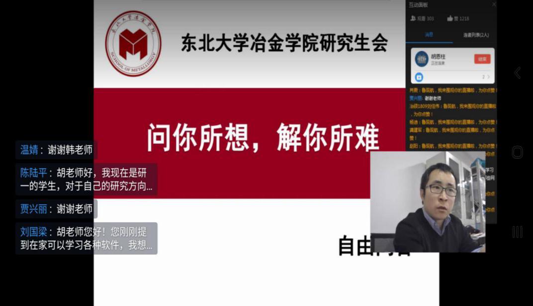 3月8日,冶金学院第二期“研究声”学术沙龙在钉钉平台以直播形式举办。活动由冶金学院研究生会主办,资源与环境研究所所长韩冲、副教授胡恩柱应邀进行指导,优秀博士生代表董梦格、温婧分享宅家学习策略和科研方法。活动吸引300余位师生参与直播互动。