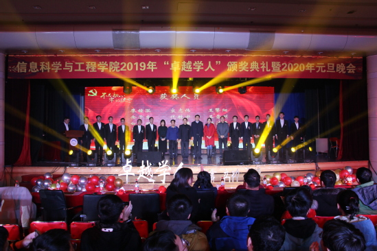 12月26日晚,信息学院“卓越学人”2019年颁奖典礼暨“‘信’火相传”2020年元旦晚会在学生活动中心多功能厅举行。校党委宣传部常务副部长闫研、校团委副书记郑兴燕、研究生院教育管理办公室主任欧阳恒岳、学生工作处副处长韩磊、学生指导服务中心副主任石昌远、创新创业学院副院长王刚,学院院长杨光红、党委书记武建军、党委副书记兼副院长亓红强、副院长张威出席典礼。
