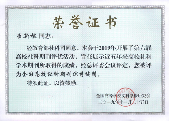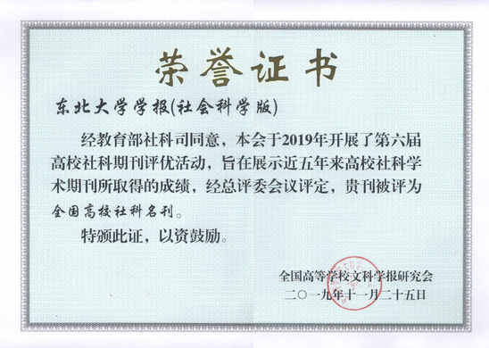 据悉,第六届全国高校社科期刊评优活动是经教育部社科司批准、由全国高校文科学报研究会组织开展,共设置“全国高校社科名刊”“全国高校社科精品期刊”“全国高校社科优秀期刊”三项期刊奖和优秀编辑奖等个人奖项,从全国1150余种高校社科期刊中评选产生。本次共评出全国高校社科名刊103种、精品期刊160种、优秀期刊201种。近年来,本刊通过关注社会热点、紧跟学术前沿、优化编审流程、拓展传播渠道、扩大社会影响等一系列举措,办刊质量和社会影响不断提升。据《中国学术期刊影响因子年报(2019年版)》,本刊2018年复合影响因子为1.705,在全国社会科学综合类期刊中排名第22,期刊影响因子为0.74,各项数据均创历史新高。