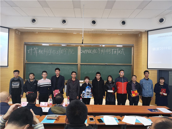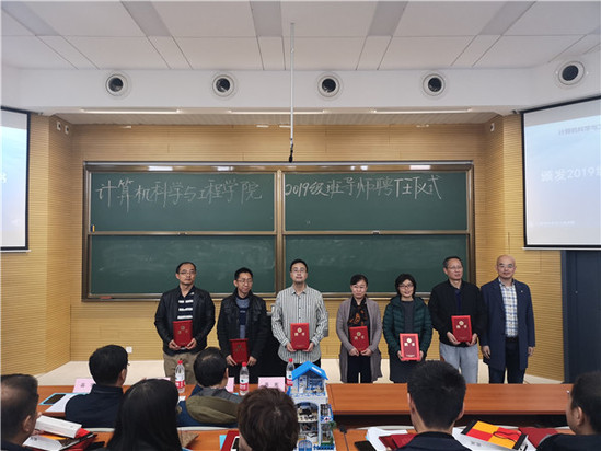 聂国东宣读了《计算机科学与工程学院关于在2019级本科生班级配备班导师的决定》,付冲、聂国东为计算机类、电子信息类、人工智能专业的班导师颁发聘书。