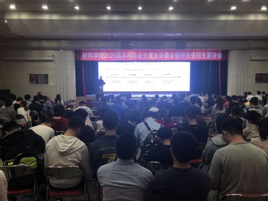 9月25日中午,材料学院2020届本科毕业生就业动员会暨研究生招生宣讲会在学生活动中心多功能厅举行。学院党委副书记兼副院长贺翔,教学科研办公室、学生工作办公室相关负责人及全体本科毕业生参加。