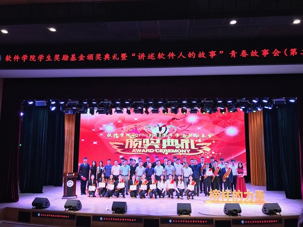 6月14日晚,软件学院在浑南校区图书馆报告厅举行2017—2018学年学生奖励基金颁奖典礼暨“讲述软件人的故事”青春故事会(第二季)。校党委副书记张国臣,学生工作处处长马天威、党委宣传部副部长史鉴、校团委副书记张忠英、学生指导服务中心副主任石昌远、创新创业学院副院长王刚,软件学院院长张斌、副院长陈东明、副院长于瑞云、副院长程维、副院长庞洪江、党委副书记兼副院长刘春风、院长助理王瑞平出席典礼。获奖代表、青春故事会讲述人及全体2018级本科生参加典礼。