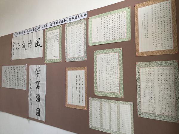活动面向支部全体成员征集硬笔、软笔两种形式的学习强国金句摘抄作品。支部成员在“学习强国”平台开展学习活动,并认真收集资料,选取相关文章,通过抄写的方式,书写了爱党爱国之情。作品在浑南校区五舍A区学院学生工作办公室进行了展示。