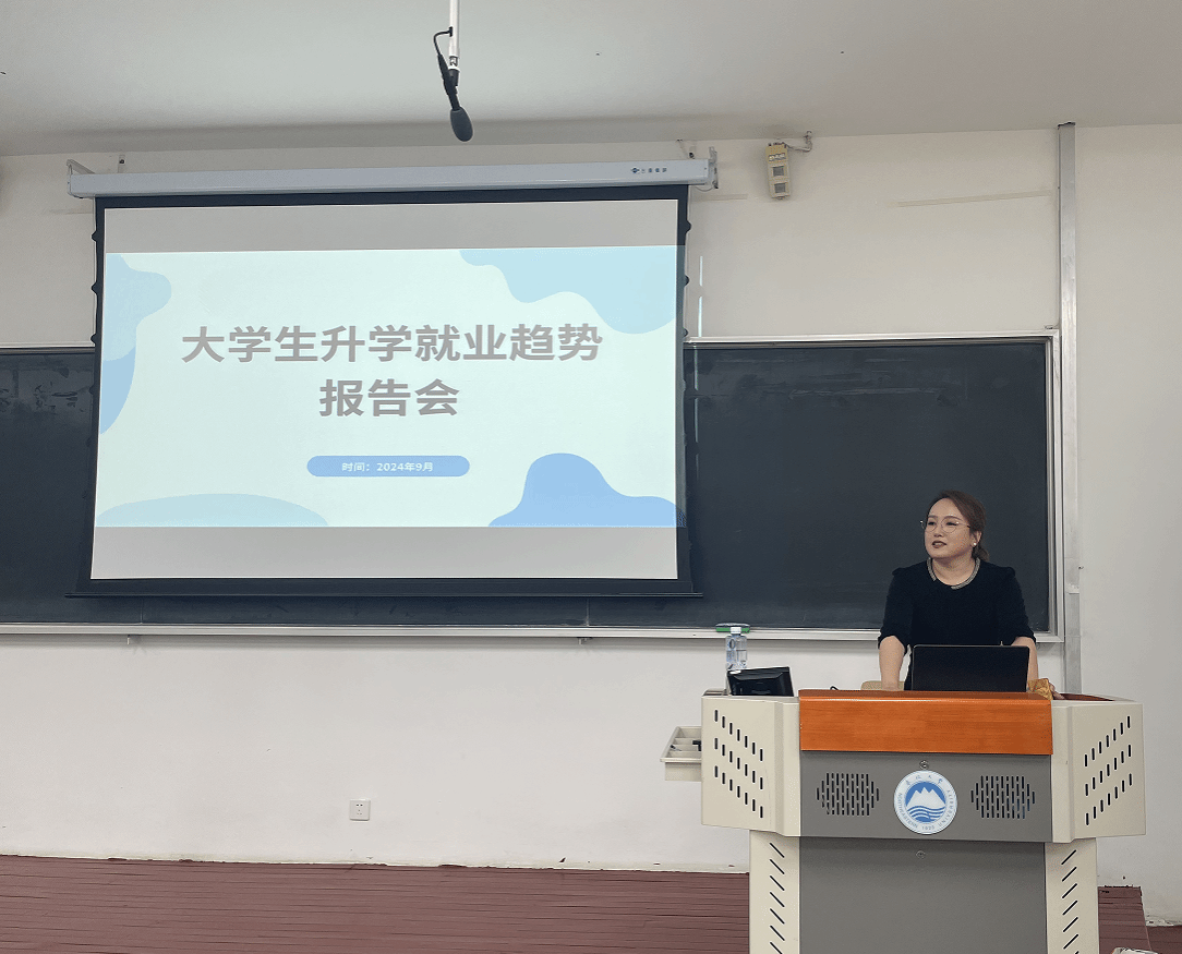 9月11日下午,外国语学院在何世礼教学馆206举办了大学生升学就业趋势专题报告会,沈阳新东方国际教育副总经理李松洋受邀担任主讲。学院党委副书记、副院长(兼)严志刚,学生工作办公室相关负责老师及2023级全体本科生参加本次报告会。
