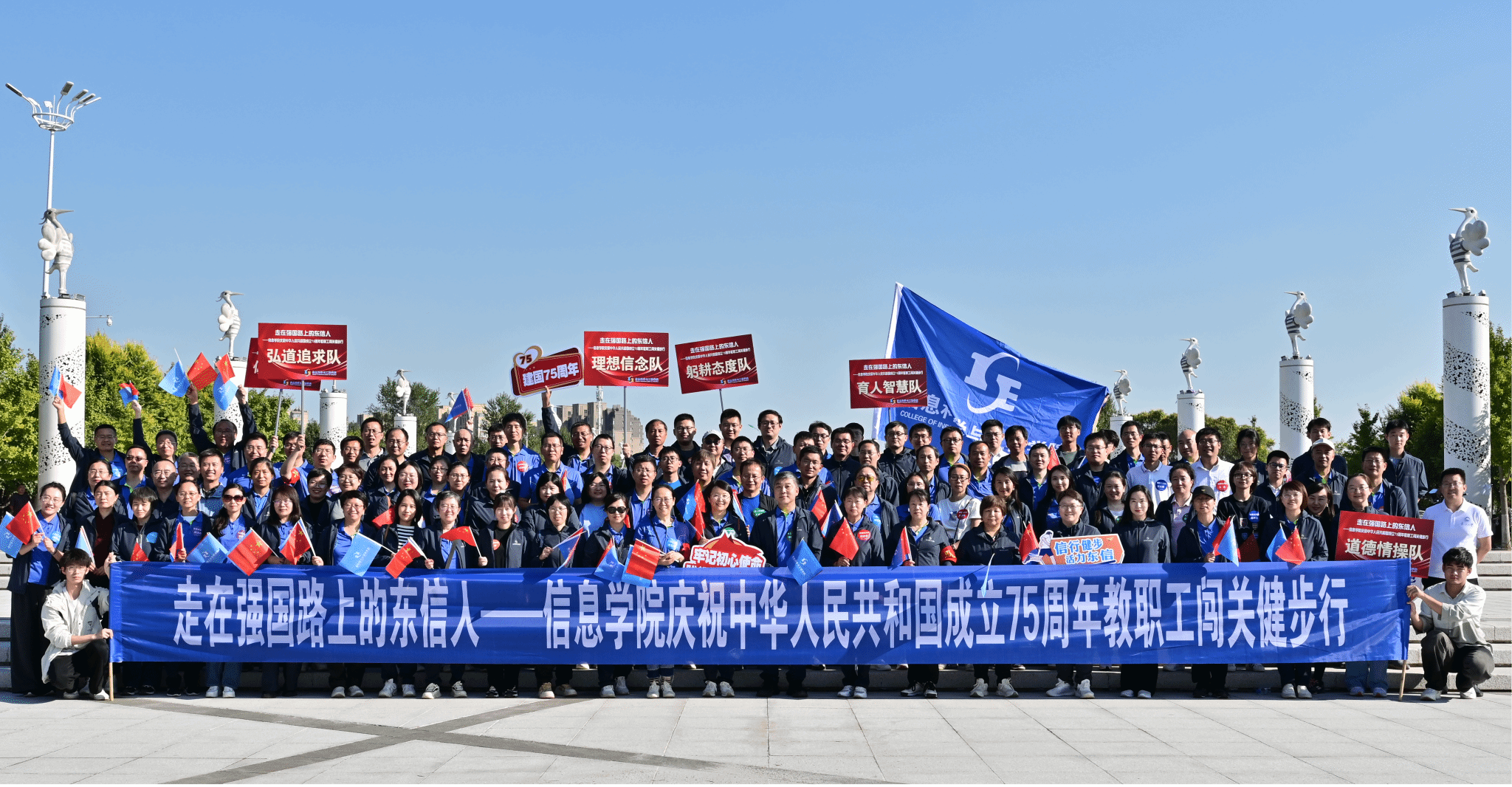活动开幕式在丁香湖主广场举行。学院党委主要负责人表示,信息学院全体教职工始终与祖国的发展同向同行,希望广大教师在学校新百年新征程上再创佳绩,健康生活、快乐工作,同心协力、争创一流,携手共创东信辉煌。广大教师共同唱响《红旗飘飘》,用歌声祝福中华人民共和国成立75周年。
