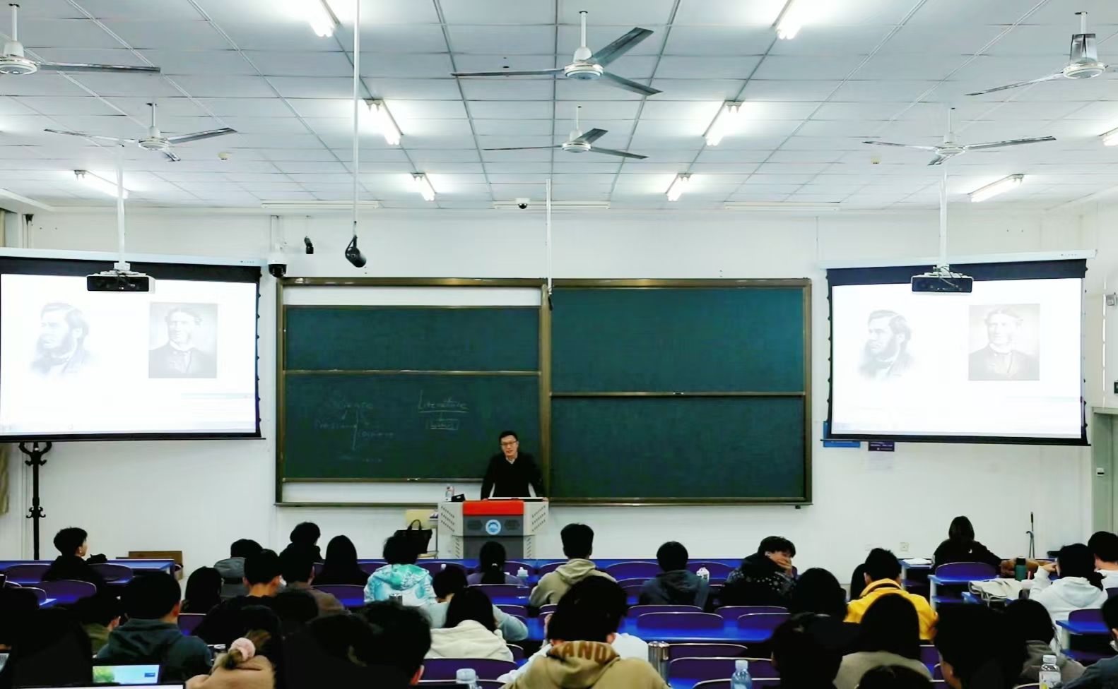 杨林聚焦19世纪末期西方“科学与文化”之争,运用丰富的案例,深入浅出地介绍了其代表人物托马斯·亨利·赫胥黎与马修·阿诺德在其代表作《科学与文化》和《文学与科学》中的学术观点与研究成果,并介绍了约翰·亨利·纽曼在《大学的理想》中关于文学的相关学术观点。杨林表示,文学经典中蕴含着行动的力量,为实际生活提供指引。希望同学们能够深入感受文学的魅力,从文学中感悟精神的力量,转化为实实在在的行动,切实做到知行合一。