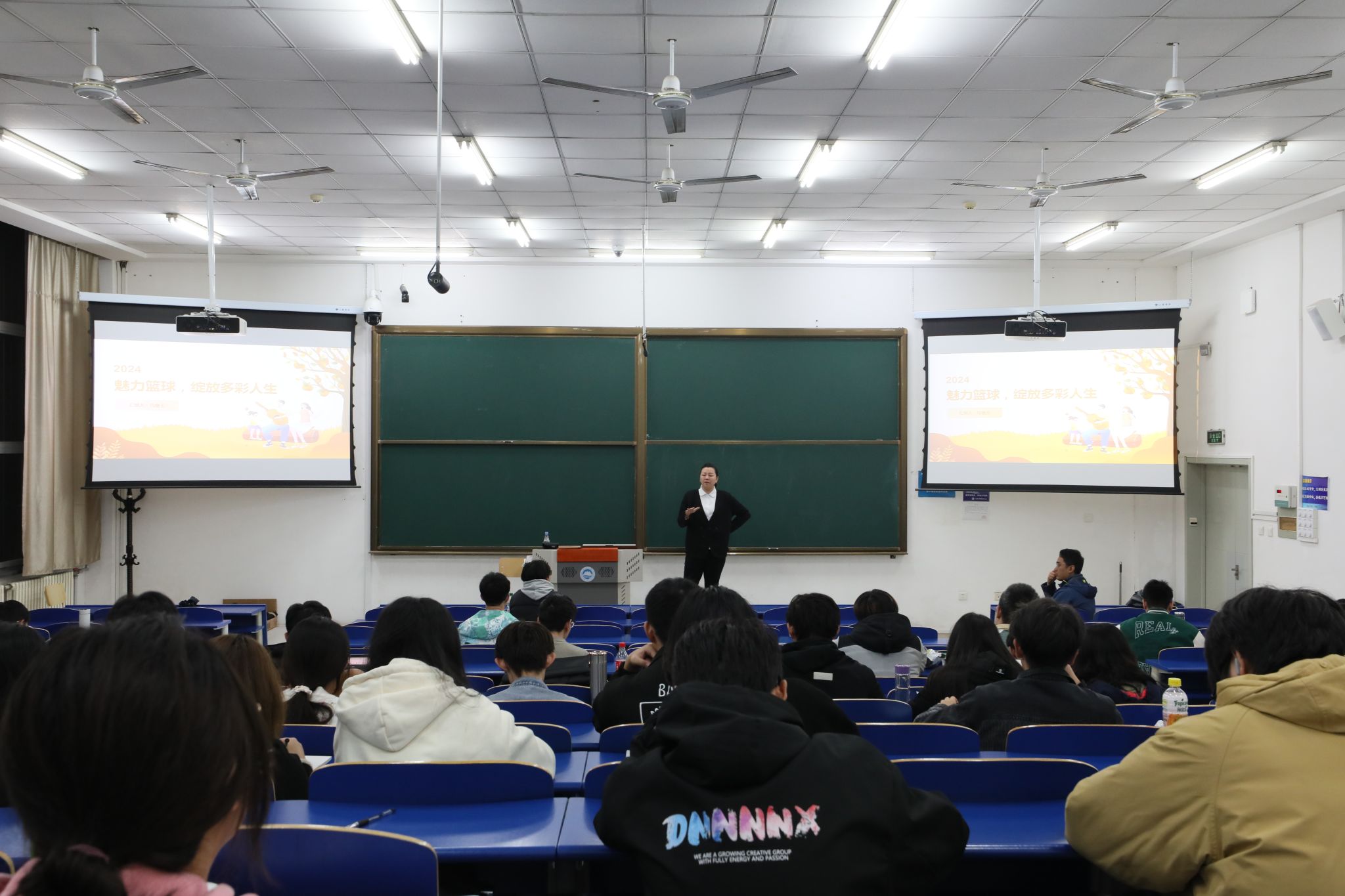 马增玉介绍了自己的篮球运动生涯,讲解了篮球运动的基础知识、篮球运动对身体各系统和心理的积极影响,并与到场学生进行了交流讨论。马增玉表示,成绩的取得离不开“认真”和“坚持”,我们要把握住当下,选择有挑战的生活,在自己选择的领域内做最好的自己。马增玉希望,大家能通过包括篮球运动在内的各项体育运动,塑造健康的体魄,培养积极地自我认知、坚韧不拔的意志品质和团队合作精神。