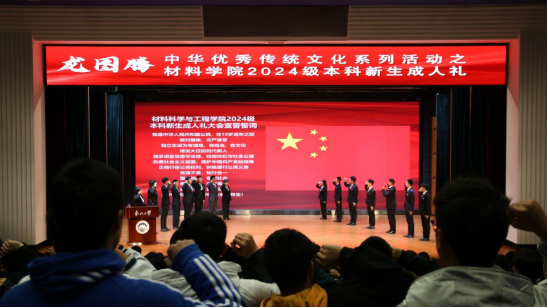 全体2024级本科新生作成人礼宣誓。辅导员为2024级本科生代表佩戴材料科学与工程学院院徽,向新生同学们提出了如何向党组织靠拢的学习和行动建议。