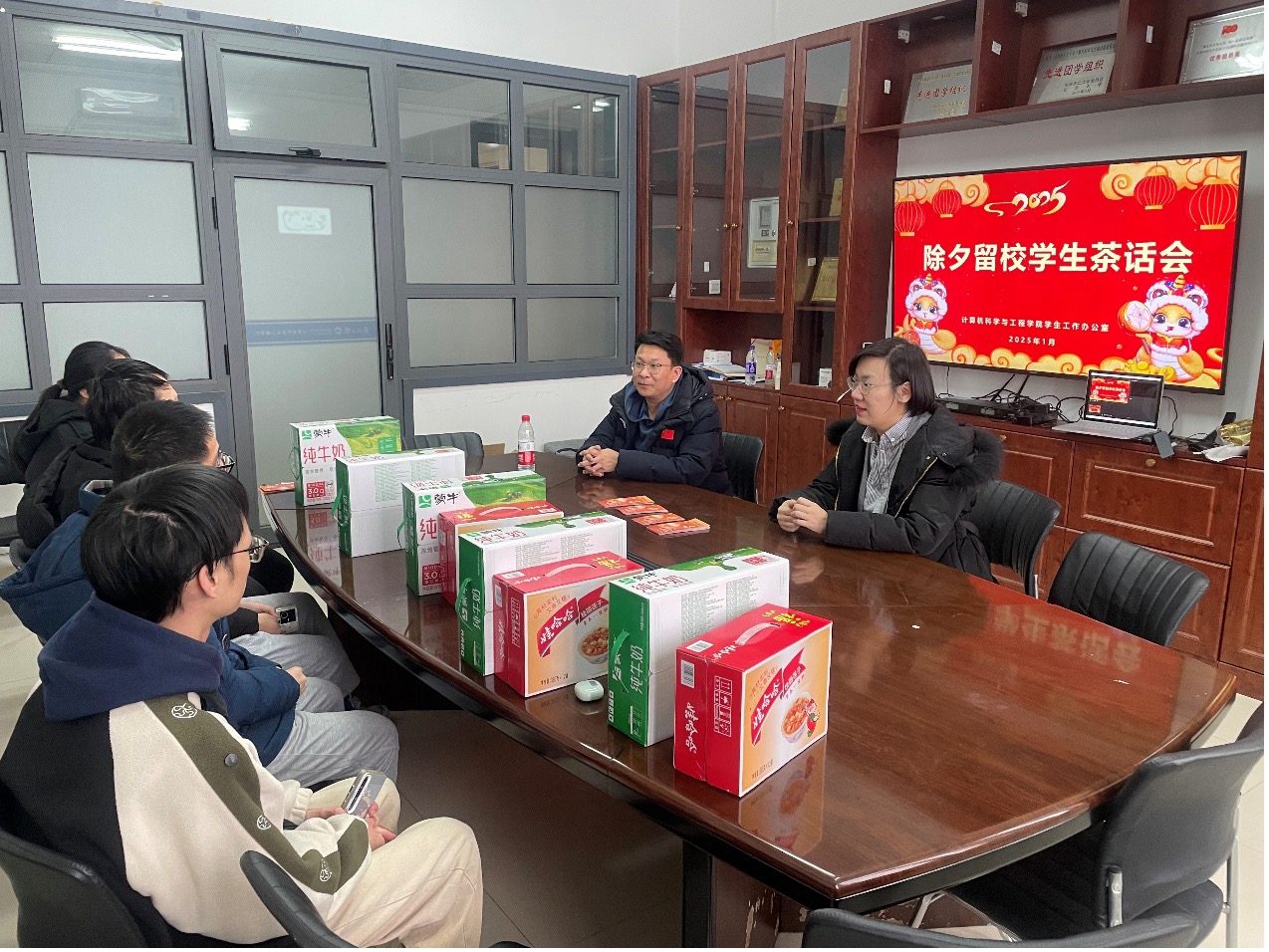 春节前夕,计算机科学与工程学院党委书记邸馗,副院长高鑫,党委副书记、副院长(兼)梁媛,党委副书记、纪委书记李传文及学院学生工作相关负责同志,通过深入学生寝室、召开座谈会等形式慰问春节留校学生,向学生们致以新春问候和节日祝福。